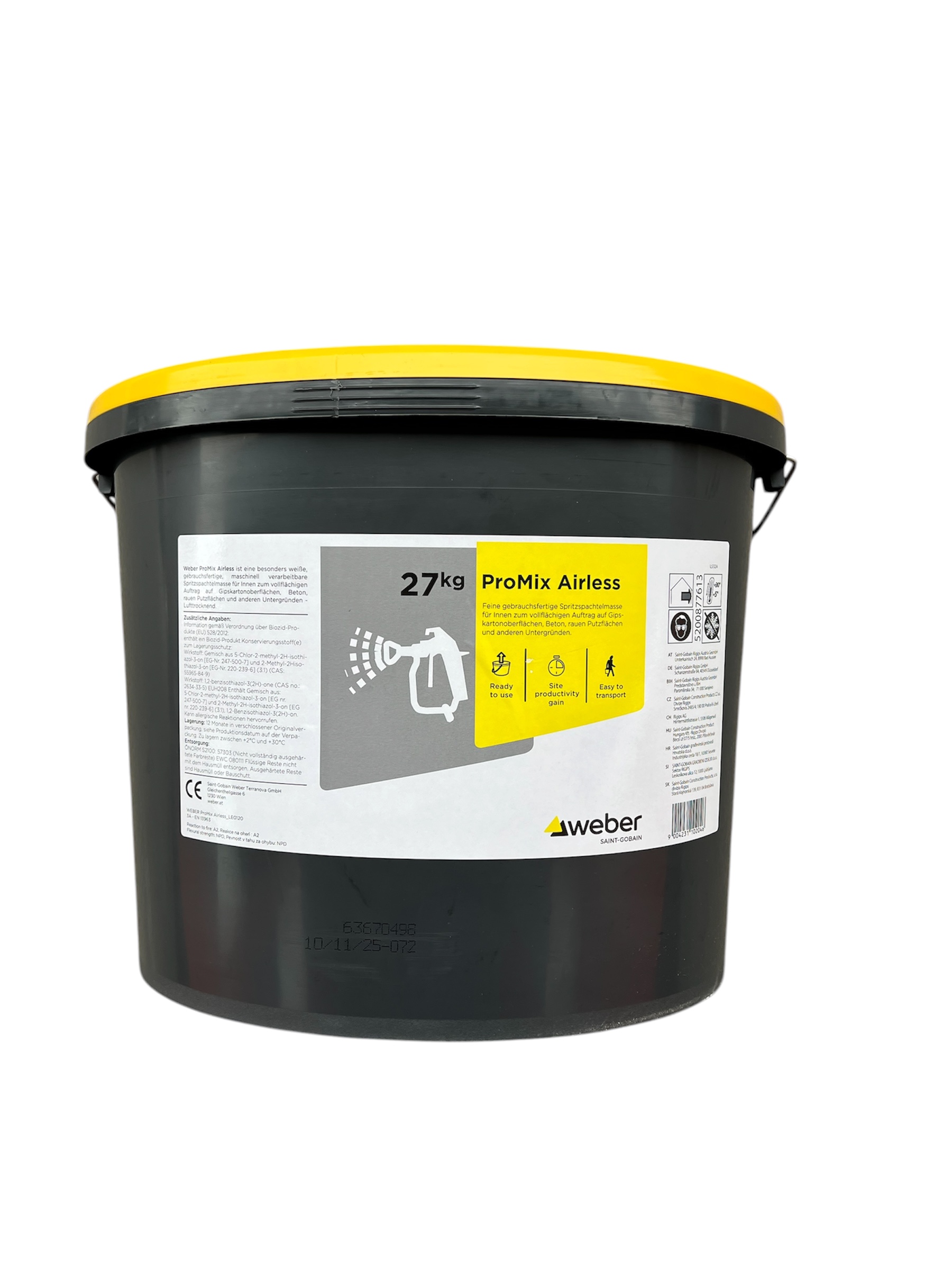 Die Weber Promix Airless von Weber ist eine gebrauchsfertige Spachtelmasse, die speziell für die maschinelle Verarbeitung mit Airless-Geräten entwickelt wurde. Sie ermöglicht eine schnelle, gleichmäßige Beschichtung großer Flächen und sorgt für optimale Ergebnisse im Innenbereich.